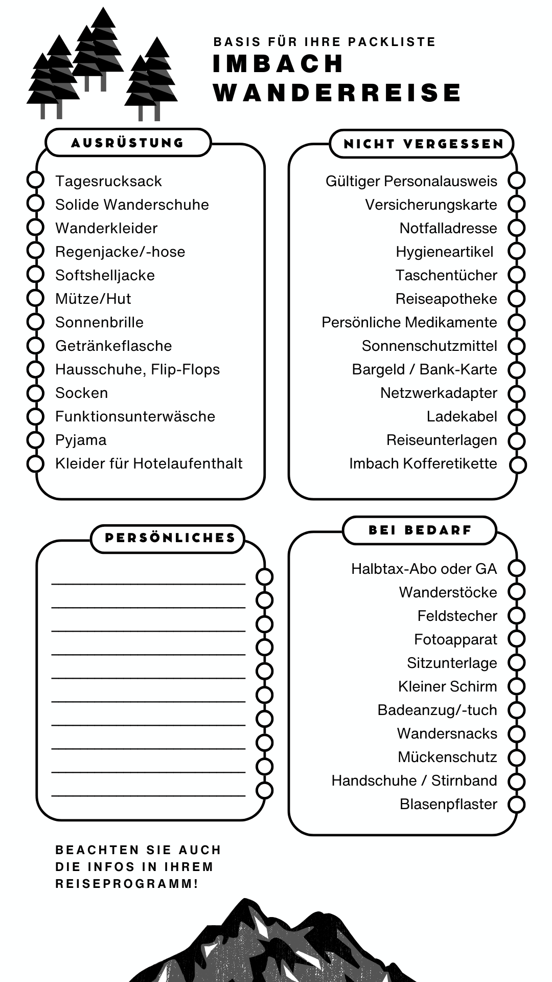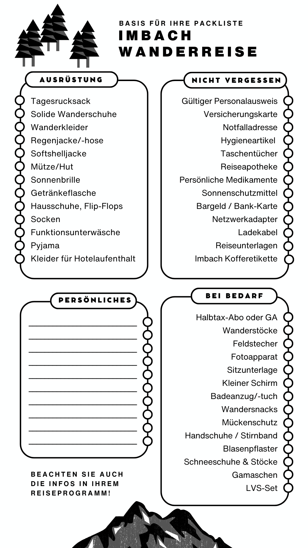 Für die Wanderungen kleiden Sie sich am besten sportlich. Für das Nachtessen empfehlen wir lockere, sportliche Kleidung. Beachten Sie jeweils auch die Hinweise in Ihrem Reiseprogramm. Dort werden Sie auf lokale Besonderheiten aufmerksam gemacht.