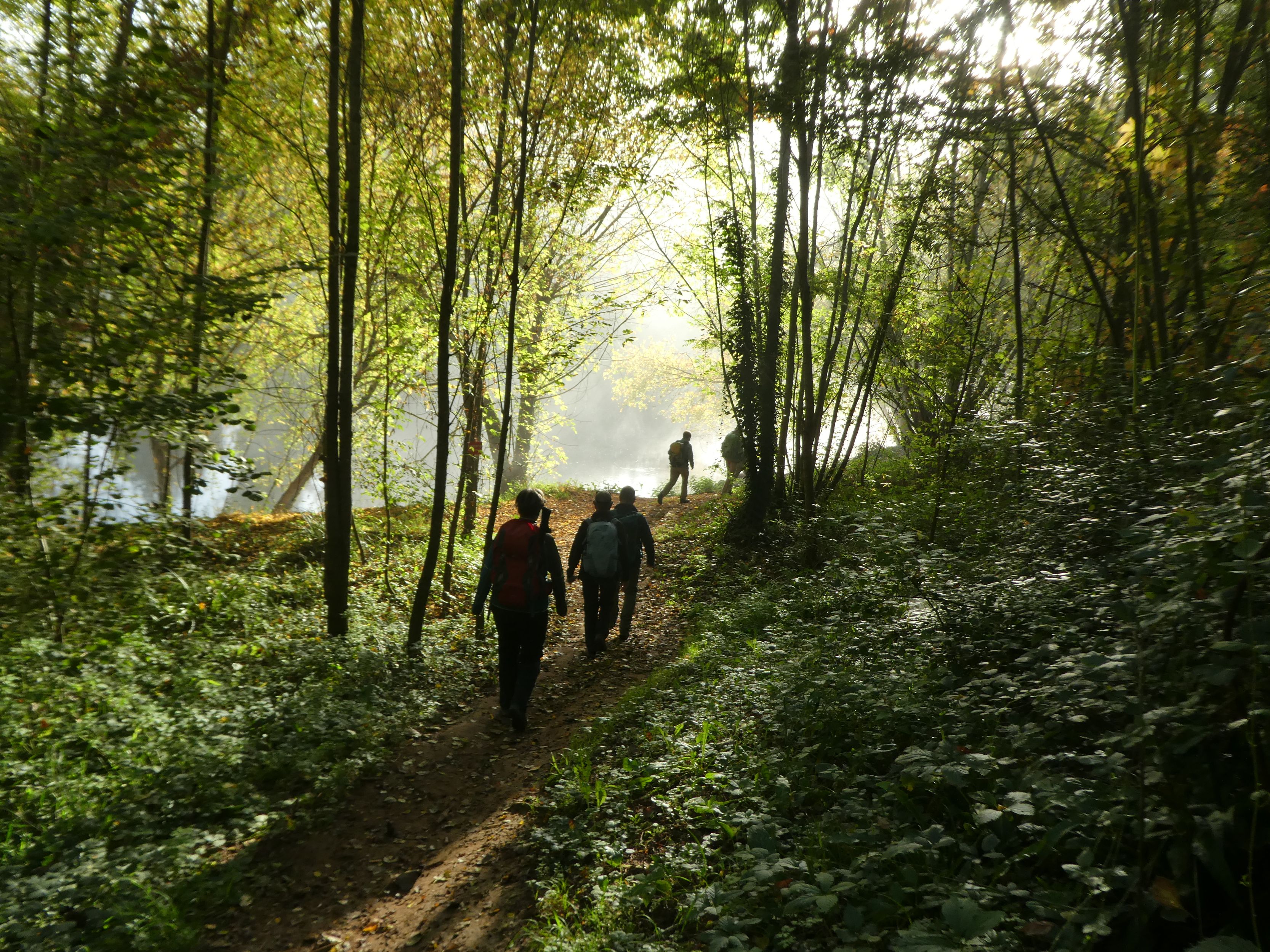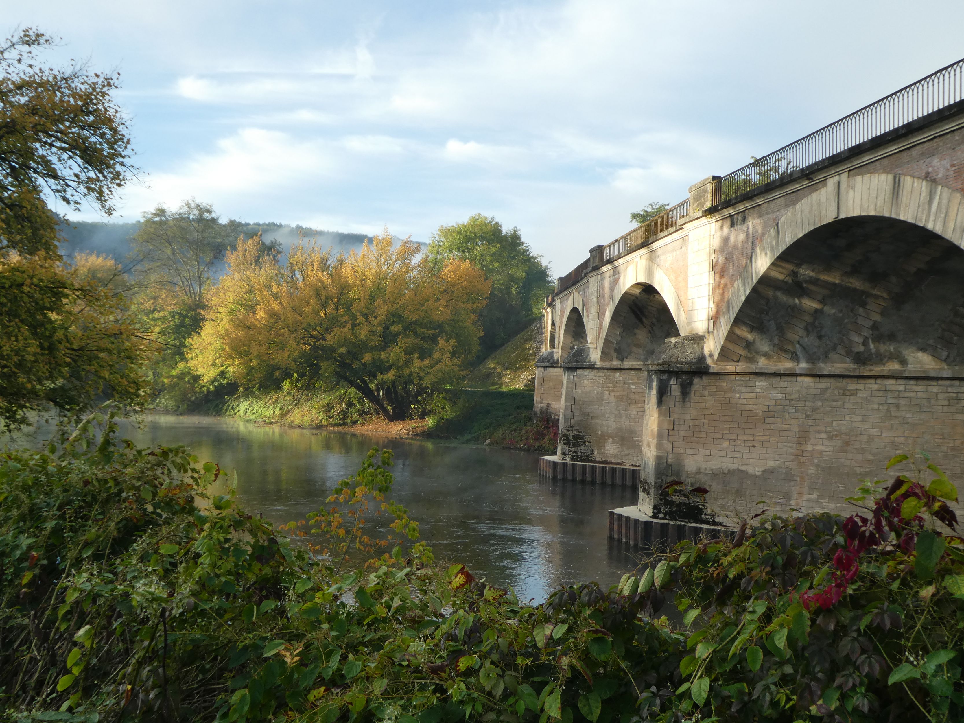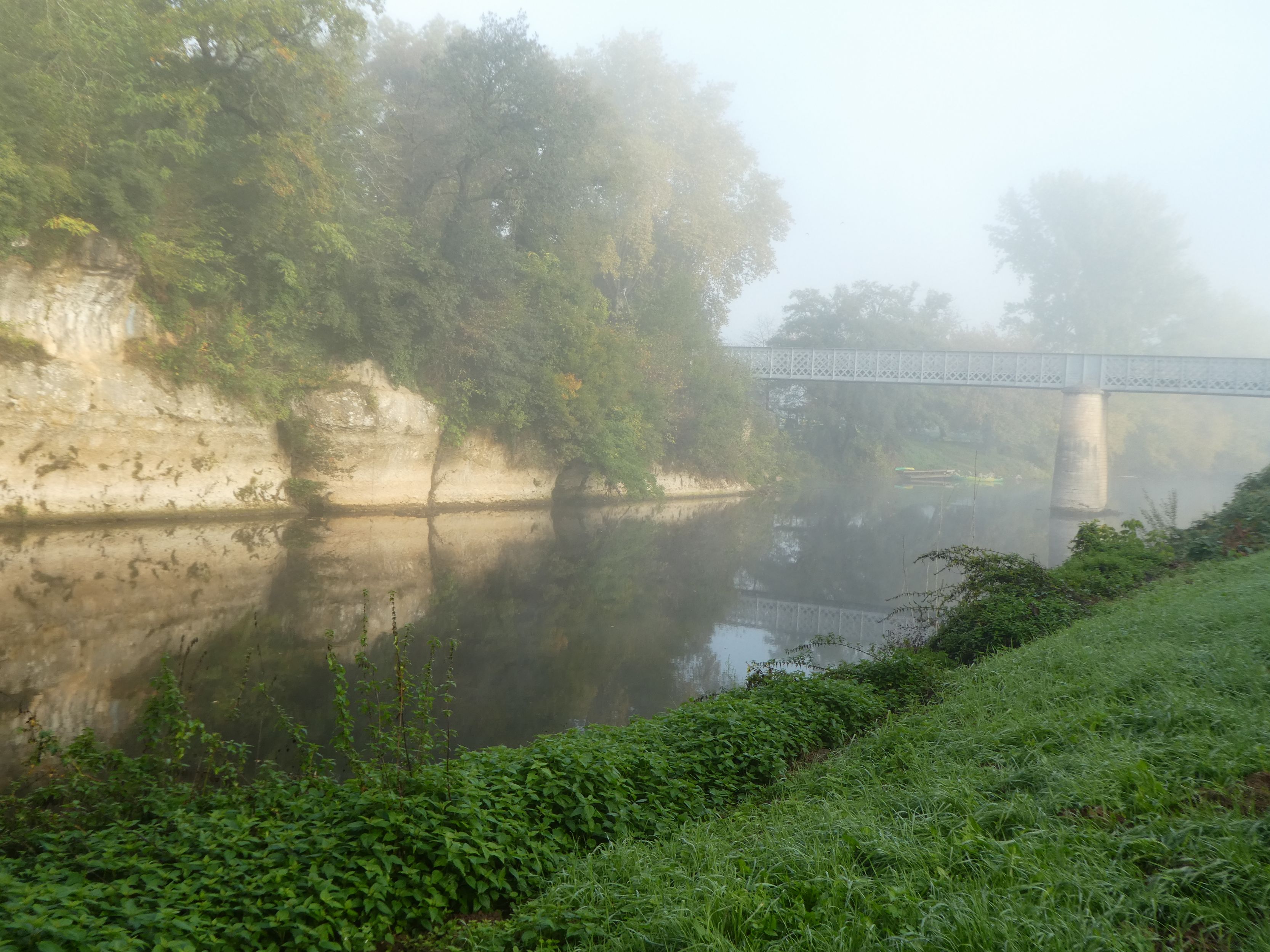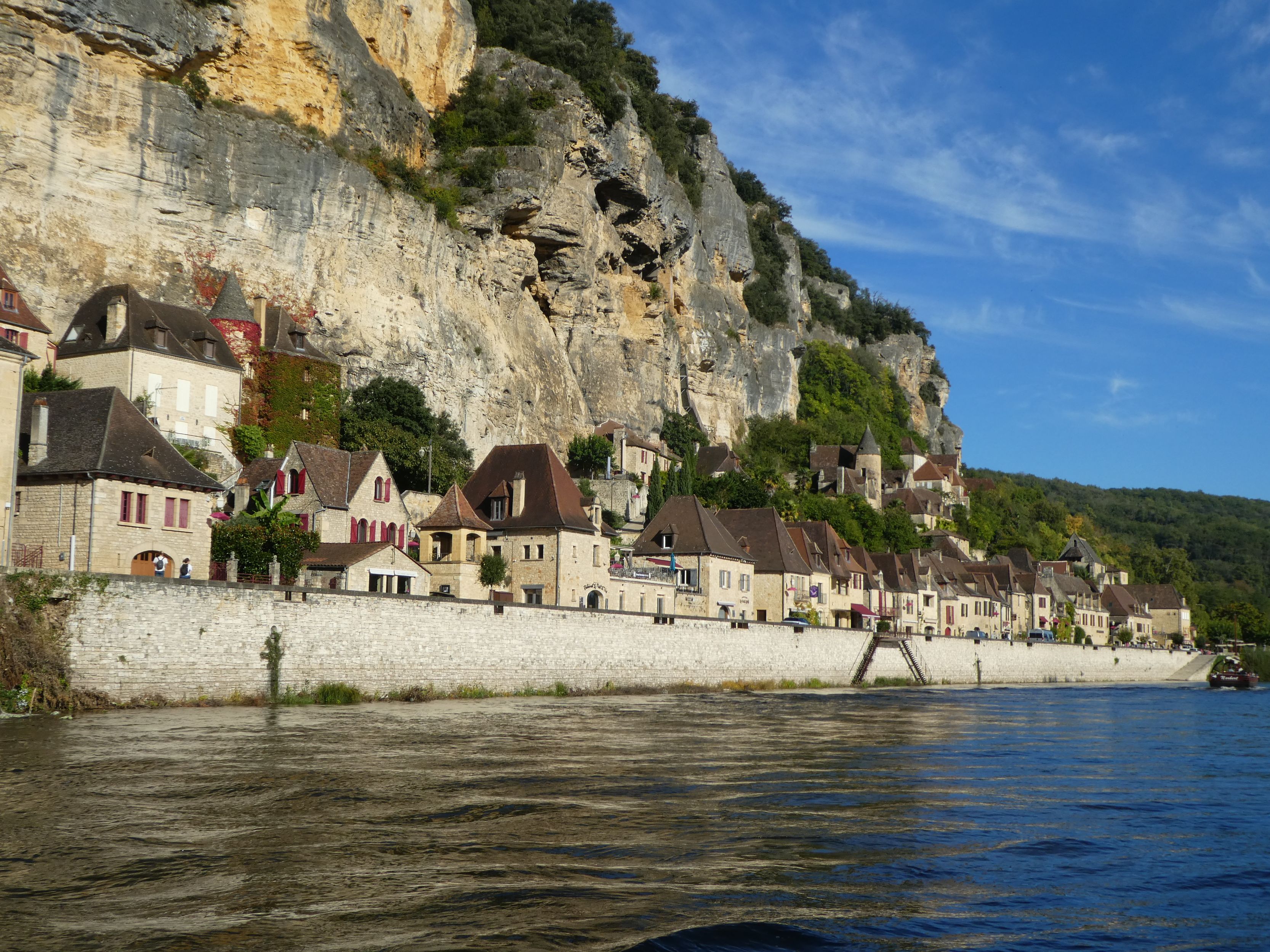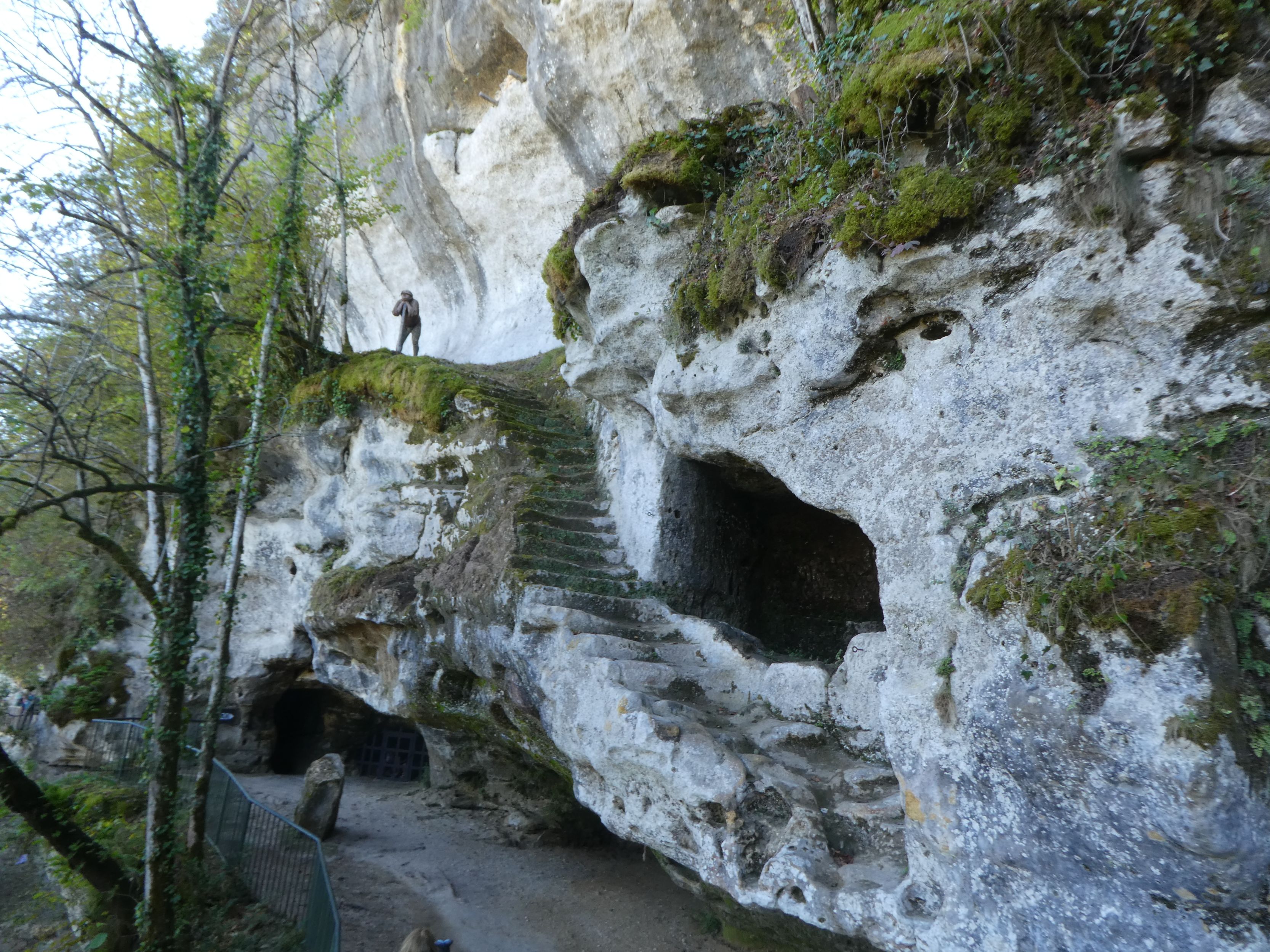 Heute seien wir prähistorisch unterwegs, erklärt uns Karin. Wir besichtigen das noch verschlafene St. Léon-sur-Vézère, bevor wir die Vézere überqueren und durch den lichtdurchfluteten Wald dem Fluss entlangwandern. Auch heute wieder dieses umwerfende Licht im Laub, auf dem samtbraunen Wasser, die Spiegelungen, die kleinen Nebelschwaden, die über dem Fluss vor sich hindampfen. Man formiert sich immer wieder neu in der Gruppe, unterhält sich bestens mit allen über alles und nichts. Zum Abschluss des Tages besichtigen wir den Roque Saint-Christophe, diesen 80m hohen und 1km langen, vom Fluss ausgewaschenen Felsen. Die natürlichen Halbhöhlen wurden schon im Jungpaläolithikum von Menschen bewohnt. Imposant und kaum vorstellbar, dass unsere Vorfahren mal so gelebt haben.