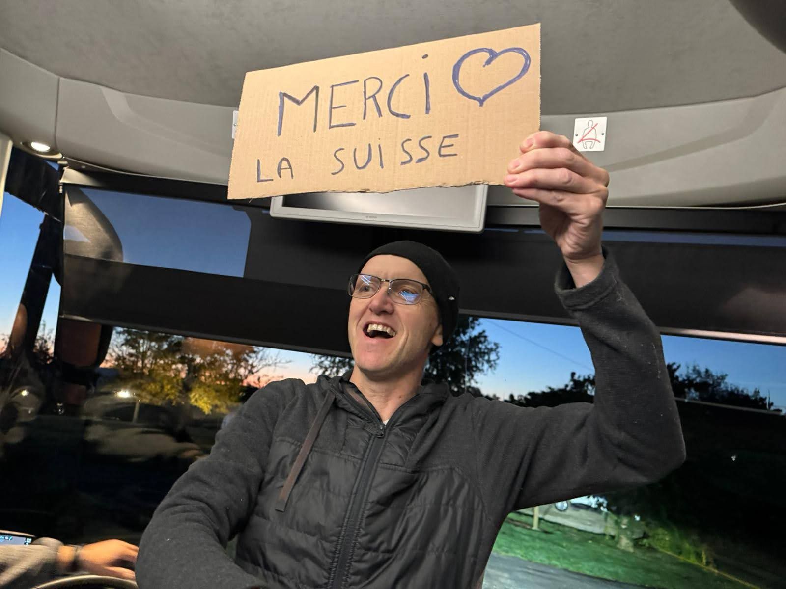 Am Tag der Rückkehr steht das Frühstück in vollem Umfang bereits um 6.30 Uhr bereit – Mickaël und Emmanuelle wollen nicht, dass wir die Reise gestresst angehen müssen. Zudem geben sie uns noch ein paar Croissants und Pains au Chocolat mit. Bevor wir abfahren, hält Mickaël vorne im Bus einen Karton hoch, auf dem geschrieben steht: Merci la Suisse! Ganz gerührt verlassen wie unsere kleine, familiäre Oase im Périgord.