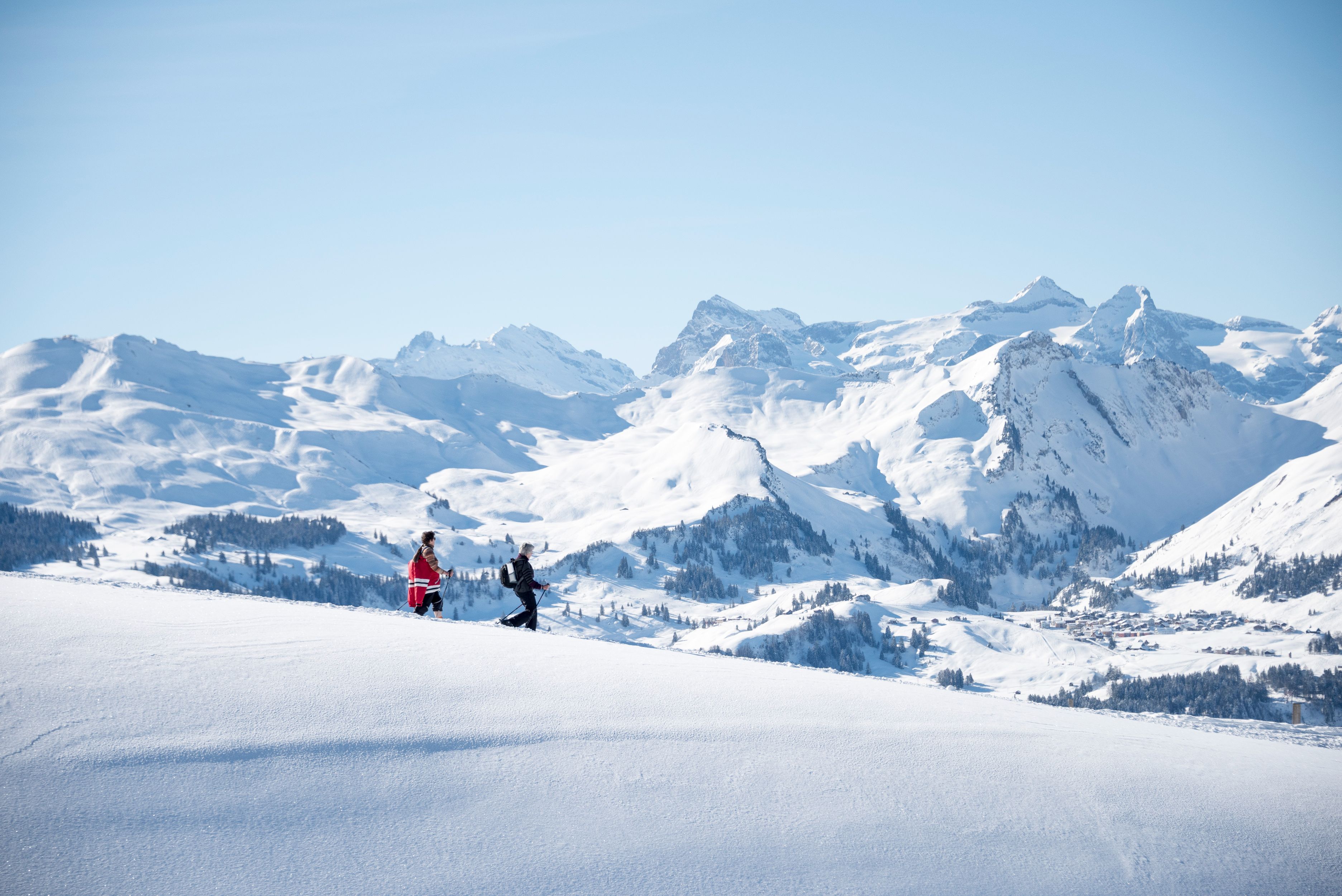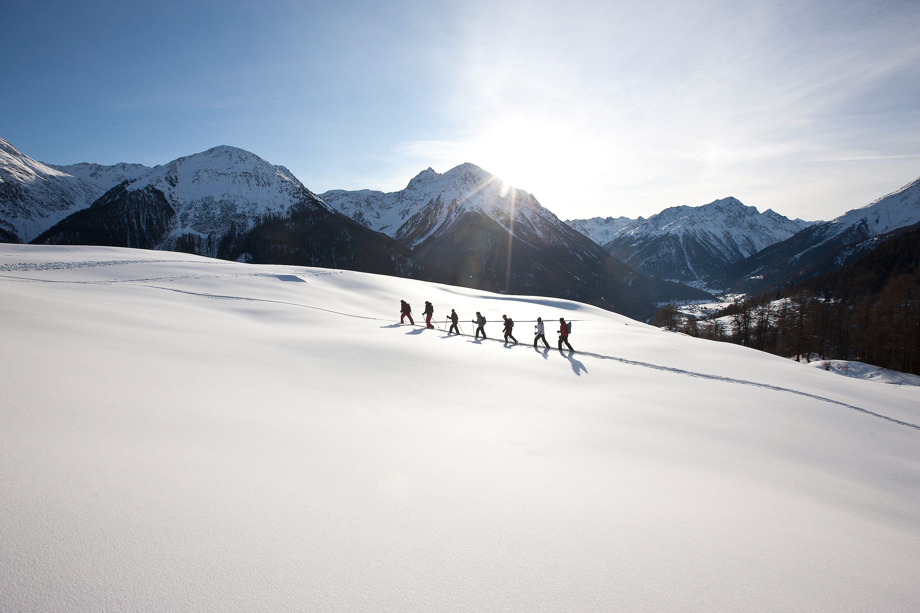 Winterwandern mit Blick auf Gletscher und Gipfel.