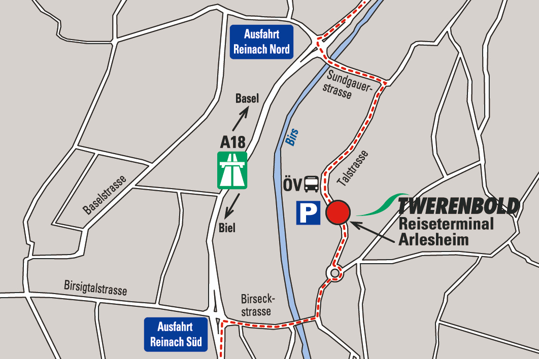 Unser Reiseterminal in der Nordwestschweiz liegt an der Talstrasse 38 in Arlesheim (BL), bei der Firma Birseck Reisen. Von Basel kommend nehmen Sie die Ausfahrt Reinach Nord und von Delémont kommend die Ausfahrt Reinach Süd.